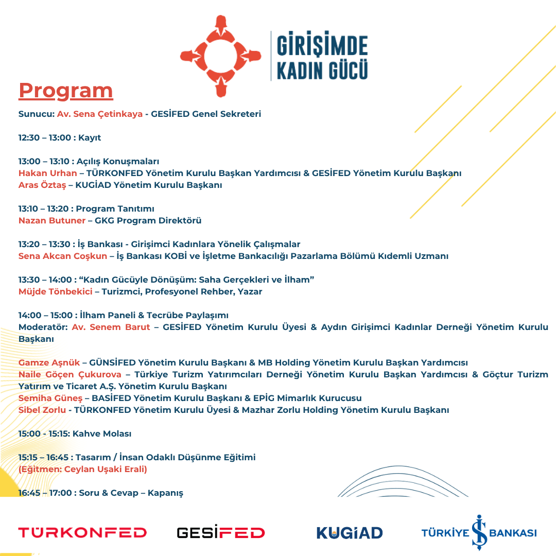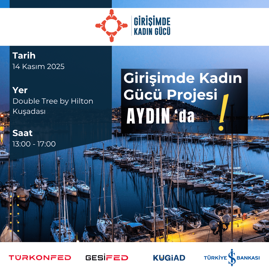 Girişimde Kadın Gücü Projesi kapsamında 14 Kasım Cuma günü saat 13:00-17:00 saatleri arasında GESİFED ve KUGİAD ev sahipliğinde, Double Tree by Hilton Kuşadası Aydın‘da düzenlenecek olan Girişimde Kadın Gücü Projesi Tasarım / İnsan Odaklı Düşünme Eğitimi etkinliğimizde sizleri de aramızda görmekten memnuniyet duyacağız.