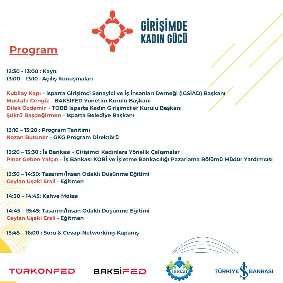Girişimde Kadın Gücü Projesi kapsamında 17 Eylül Çarşamba günü saat 13:00-16:00 saatleri arasında BAKSİFED ve IGSİAD ev sahipliğinde, Isparta’da Barida Hotels‘de düzenlenecek olan Girişimde Kadın Gücü Projesi Tasarım / İnsan Odaklı Düşünme Eğitimi etkinliğimizde sizleri de aramızda görmekten memnuniyet duyacağız.