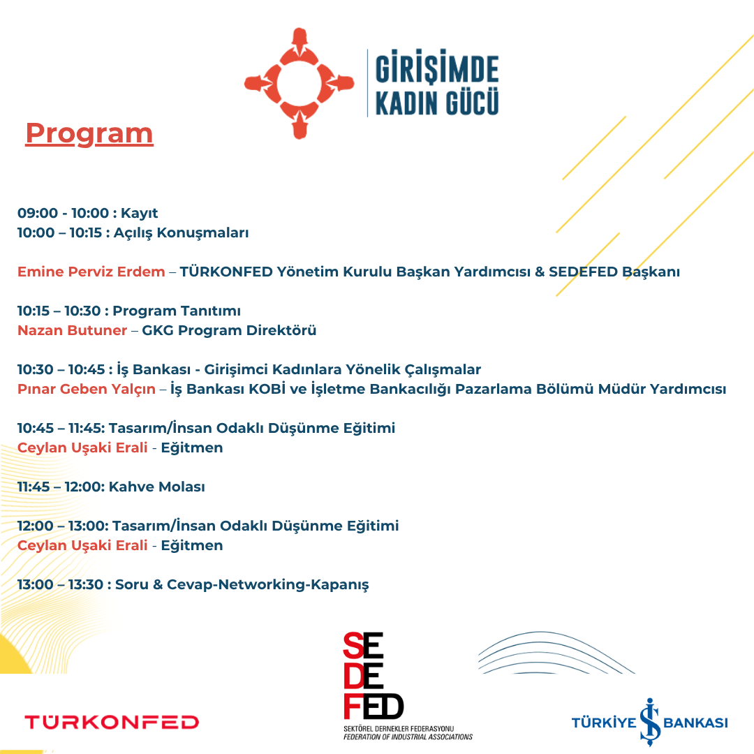Girişimde Kadın Gücü Projesi kapsamında 27 Ekim Pazartesi günü saat 10:00-13:30 saatleri arasında SEDEFED ev sahipliğinde, Point Hotel Barbaros İstanbul‘da düzenlenecek olan Girişimde Kadın Gücü Projesi Tasarım / İnsan Odaklı Düşünme Eğitimi etkinliğimizde sizleri de aramızda görmekten memnuniyet duyacağız.