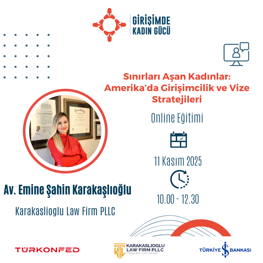 📅 11 Kasım 2025 Salı günü, saat 10:00 – 12:30 arasında gerçekleşecek “Sınırları Aşan Kadınlar: Amerika’da Girişimcilik ve Vize Stratejileri” başlıklı çevrim içi etkinliğimize sizleri de aramızda görmekten mutluluk duyarız. 🌸🌟